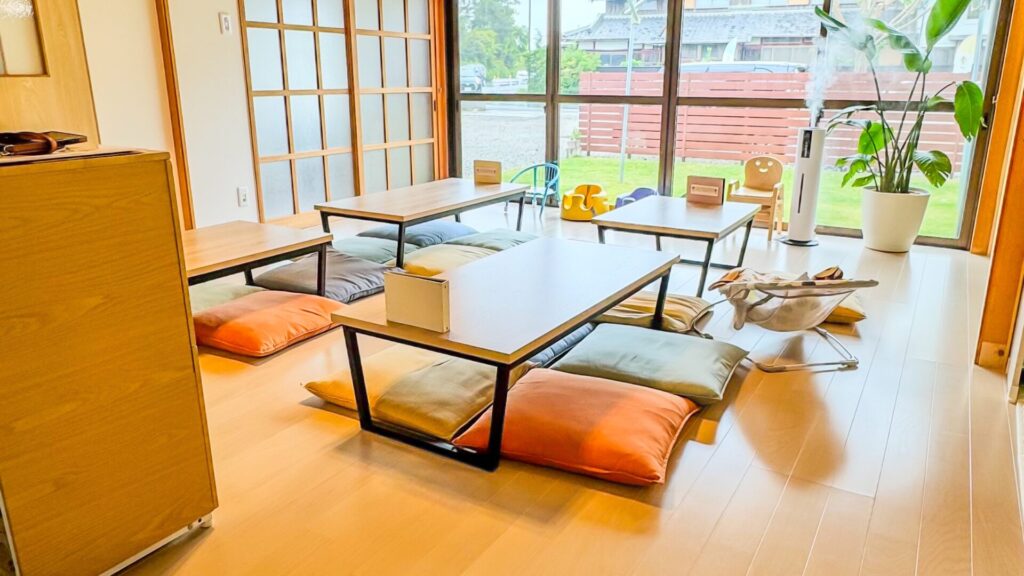 靴を脱いで上がる小上がり空間のカフェ。