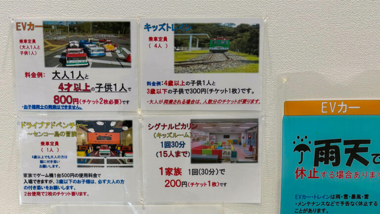 EVカーやキッズトレインなど子どもが大喜びする乗り物が豊富で、3歳以下の子どもは全アトラクションが無料で楽しめます。