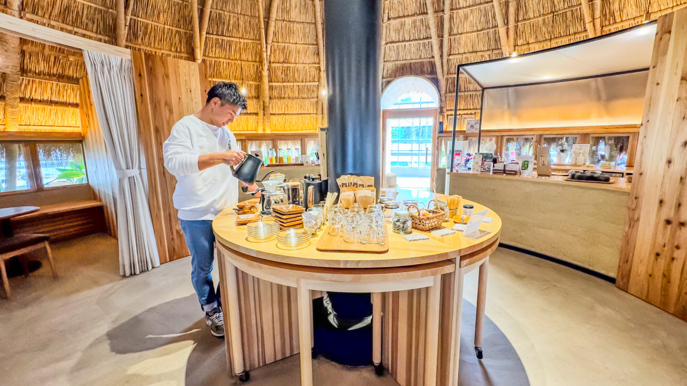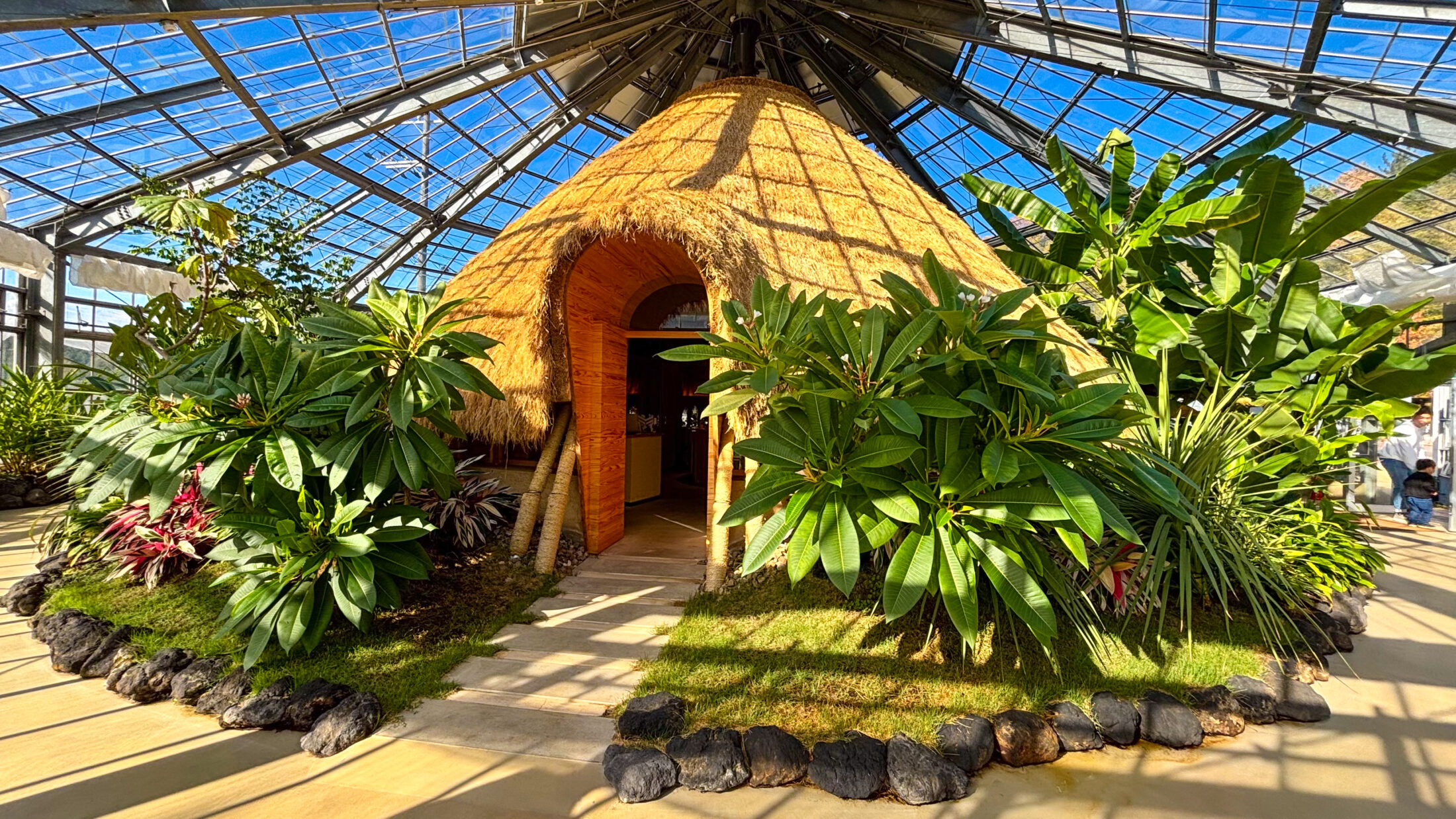 お洒落な藁の建物内でいちごやスイーツ、ドリンクを贅沢に堪能できます。