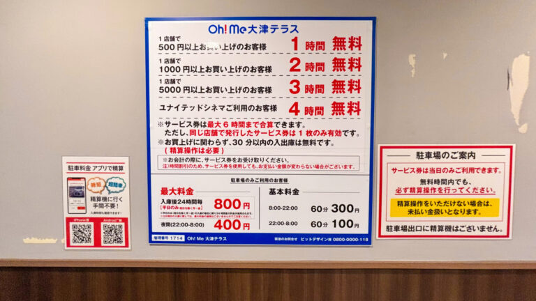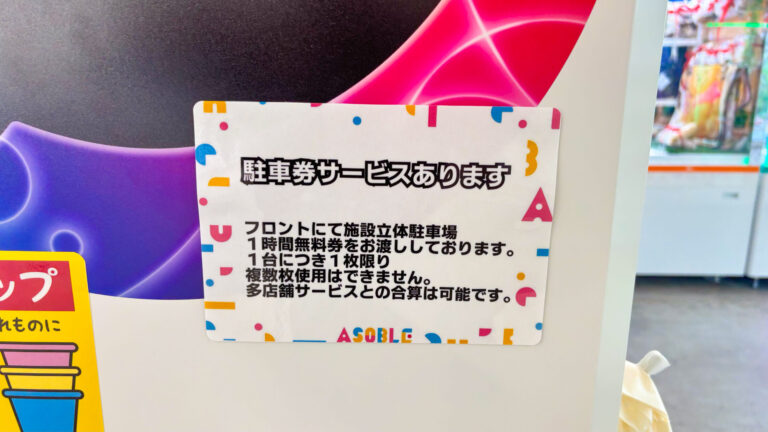 | サービス | 1店舗で500円以上購入1時間無料 |