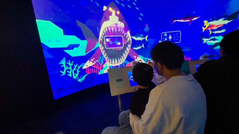 マイクに向かって声を出したり手元の画面を連打、サメを倒し、魚を捕まえます。